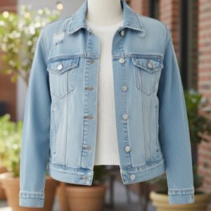 Women Light Blue Washed Spread Collar Denim Jacket