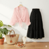 Women pink Shirts Loose Casual with Black Skirt